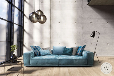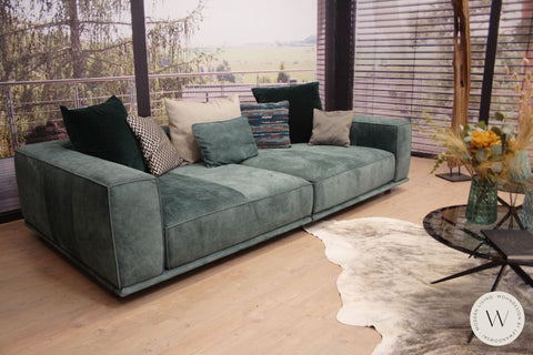 Das abgebildete BIG SOFA Modell WUMMS! besteht aus einer Ottomane tief links 62t und einer Ottomane tief rechts 61t überzogen in einem feinen Leder Desperado 2120/17 (Farbe siehe Abb. petrol).