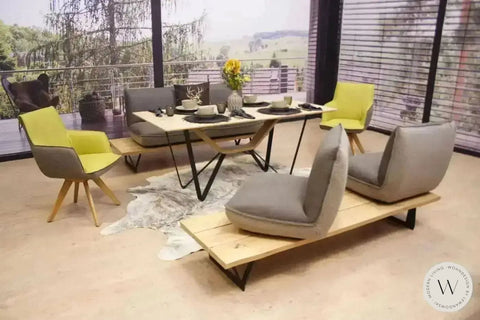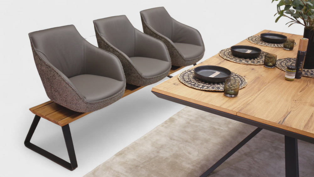 Die abgebildete Dinnerbank Modell Movy (Holzplateau in Wildeiche natur) von Koinor besteht aus einem 3-Sitzer Element NA3X überzogen in einer exklusiven Leder- Stoffkombination aus einer Leder B Bull carbone (Bezugsteil 1 / Sitz) & einem Stoff Venga 10-84 (Bezugsteil 2 / Rücken), ausgestattet mit einer Flachstahlkufe in schwarz matt.