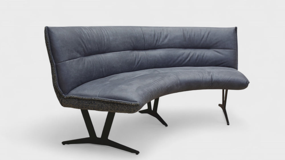 Die abgebildete Dinnergruppe Modell Essay von Koinor besteht aus einer Rundbank SB2 auf einer Schwertkufe N°3 in matt schwarz und 3 Stühlen Modell 1250 S1MX auf einem drehbaren Mikadountergestell ebenfalls in matt schwarz. Bezogen ist die Dinnergruppe in einer Kombination aus einer feinen Mikrofaser Bison 13-69 (Bezugsteil 1 / Sitz) und einem exklusiven Stoff Venga 10-69 (Bezugsteil 2 / Rücken).