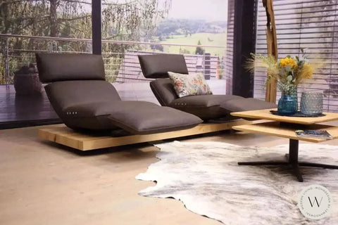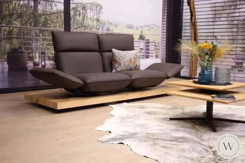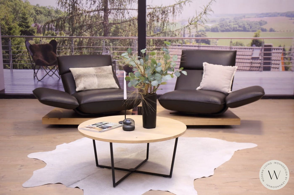 Das abgebildete Modell Experio (Plateau in Balkeneiche furniert) von Koinor ist ein Funktionselement 2-sitzig C4 mit Baumrindeneinlage, überzogen in einem feinen Leder B Bull Nero.