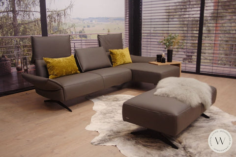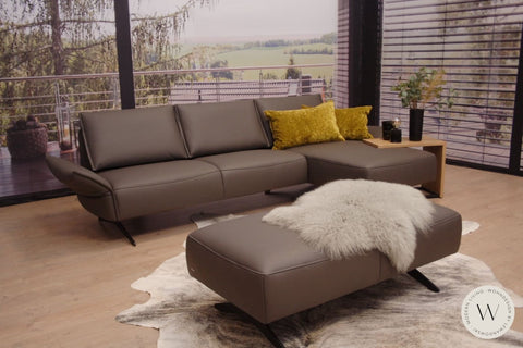 Das abgebildete Modell Harriet von Koinor besteht aus einem 2,5-Sitzer Sofa EH und einem 2-Sitzer Sofa BH, versehen mit einem Massivholzrahmen in Wildeiche und einem Metallfuß in Aluminium matt (satiniert). Die Garnitur ist mit einem feinen Leder B Bull carbone (Farbe siehe Abb. graubraun) überzogen.