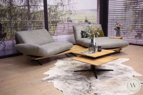 Die abgebildete Eckgarnitur Modell Manson ( Holzplateau in Wildeiche natur massiv ) von Koinor besteht aus einer Liege PLX links ( mit Armteil ) und einem Element ERX rechts ( mit Armteil ).