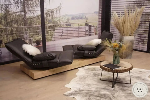Das abgebildete Sofa Modell Edit 2 (Plateau in Echtholzfurnier Balkeneiche geölt) von Koinor ist ein Funktionselement 2-sitzig C inkl. 2x Armteilkissen YA2, überzogen in einem exklusiven Leder D Velvet gunmetal (Farbe s. Abb. schwarz).