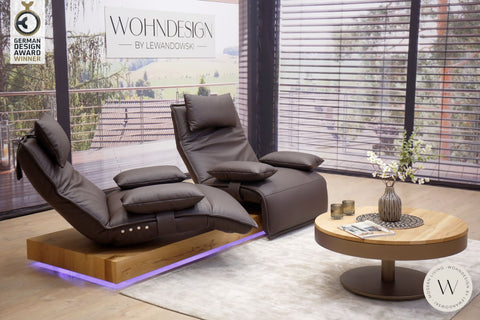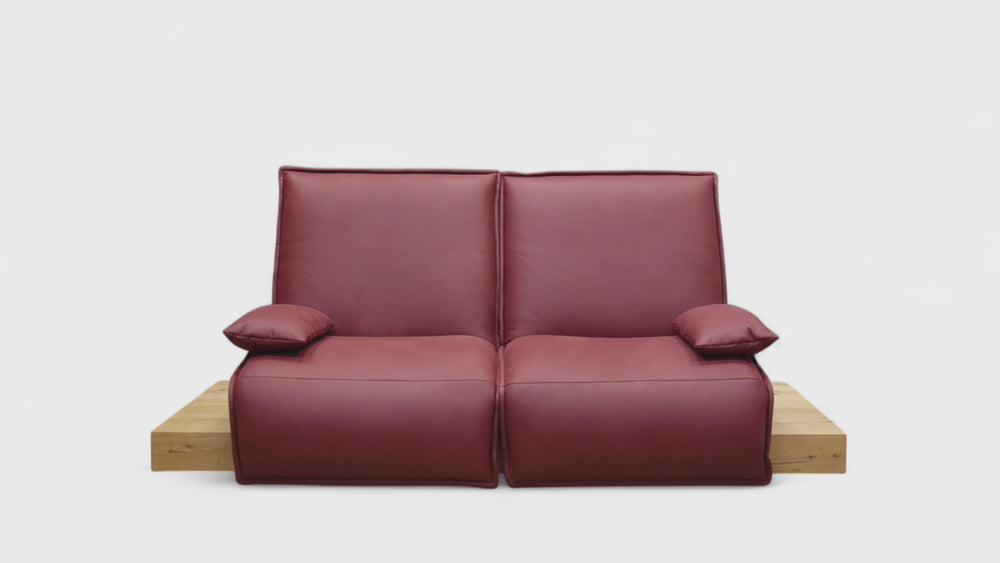 Das abgebildete Funktionselement 2-sitzig C, Modell EPOS 3 von KOINOR ist mit einem Plateau aus Echtholzfurnier in Balkeneiche geölt versehen und in einem exklusiven Leder D Velvet rubin überzogen, ebenfalls im Lieferumfang enthalten sind 2 Armteilkissen YA2.