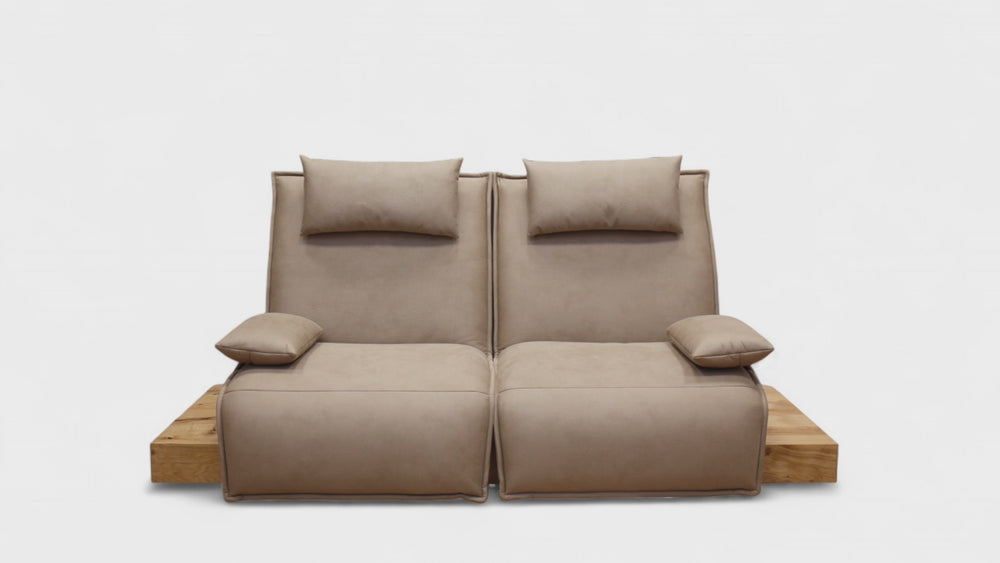Das abgebildete Modell Epos 3 (Plateau in Echtholzfurnier Balkeneiche geölt) von Koinor besteht aus einem Funktionselement 2-sitzig C inkl. 2x Armteilkissen YA2 & 2x Nackenkissen YN, versehen mit einem Metallfuß (12 cm hoch). Überzogen ist das Sofa in einer feinen Mikrofaser Zenit 13-29 (Farbe s. Abb.).