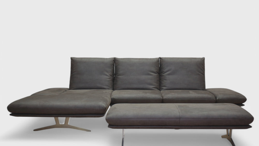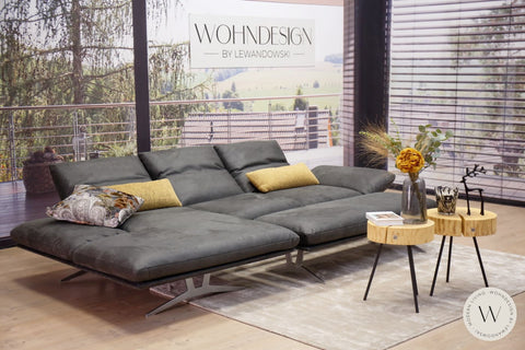 Die abgebildete Eckgarnitur Modell Francis von Koinor besteht aus einer Liege PL links und einem 2,5-Sitzer rechts ER, überzogen in einer feinem Mikrofaser Bison 13-89 (Farbe s. Abb.). Ausgestattet ist das Sofa mit einer legeren Polsterung und einer Schwertkufe in nickel satiniert.