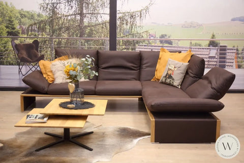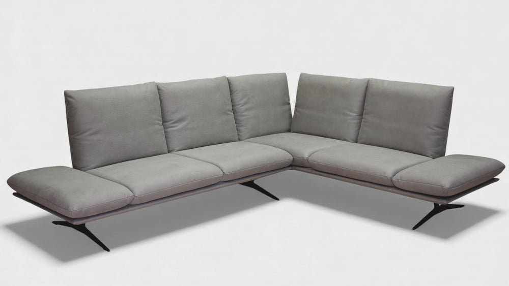 Die abgebildete Eckgarnitur Modell Francis von Koinor besteht aus einem 2,5 Sitzer EL (links) und einem Anbaueck OR (rechts). Die Granitur ist in einer strapazierfähigen Mikrofaser Zenit 13-21 (Farbe s. Abb.) überzogen und mit einer Kufe in schwarz matt versehen.
