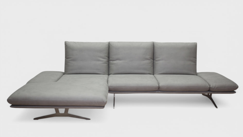 Die abgebildete Eckgarnitur Modell Francis von Koinor besteht aus einer Liege PL links und einem 2,5-Sitzer rechts ER, überzogen in einer feinem Mikrofaser Zenit 13-21 (Farbe siehe Abb.). Ausgestattet ist das Sofa mit einer legeren Polsterung und einer Schwertkufe in nickel satiniert.