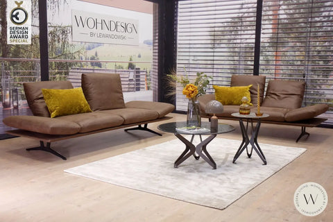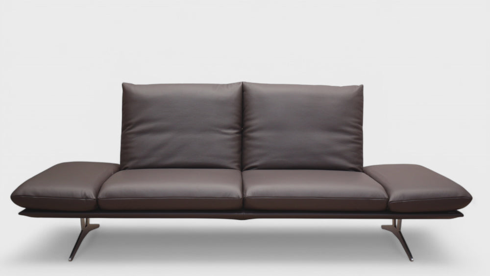 Das abgebildete Modell Francis von Koinor besteht aus einem 2,5-Sitzer Sofa E und einem 2-Sitzer Sofa B, ausgestattet mit einer Metallkufe in nickel satiniert (Edelstahloptik). Überzogen ist das Sofa in einem feinem Leder B Bull moretto (Farbe siehe Abb.).