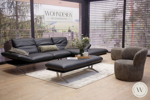 Das abgebildete Modell Francis von Koinor besteht aus einer Liege PL (Armteil links) und einem 2,5-Sitzer Sofa ER (Armteil rechts), ausgestattet mit einer Metallkufe in nickel satiniert. Überzogen ist das Sofa in einem feinem Leder B Bull nero (Farbe s. Abb. schwarz).