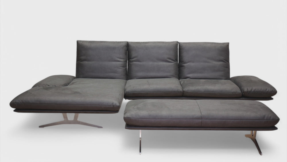 Das abgebildete Modell Francis von Koinor besteht aus einer Liege PL (Armteil links) und einem 2,5-Sitzer Sofa ER (Armteil rechts) ausgestattet mit einer Metallkufe in nickel satiniert (Edelstahloptik). Überzogen ist das Sofa in einer feinen Mikrofaser Bison 13-98 (Farbe s. Abb. stein).