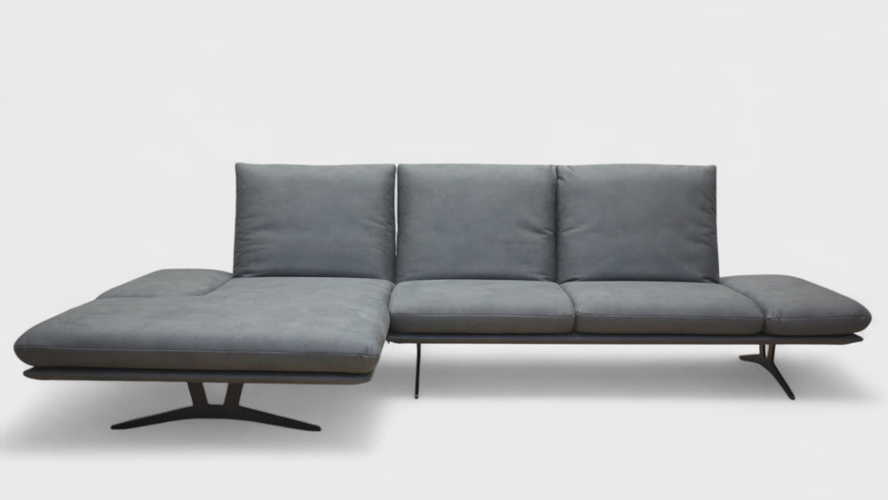 Das abgebildete Modell Francis von Koinor besteht aus einer Liege PL (Armteil links) und einem 2,5-Sitzer Sofa ER (Armteil rechts), ausgestattet mit einer Metallkufe in matt schwarz. Überzogen ist das Sofa in einer feinen Mikrofaser Zenit 13-97 (Farbe s. Abb.).