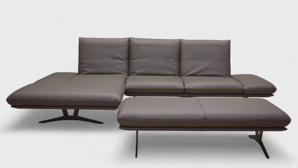 Das abgebildete Modell Francis von Koinor besteht aus einer Liege PL (Armteil links) und einem 2,5 Sitzer Sofa ER (Armteil rechts), ausgestattet mit einer Metallkufe in schwarz matt. Überzogen ist das Sofa in einem feinem Leder B Bull carbone (Farbe s. Abb.).