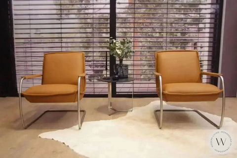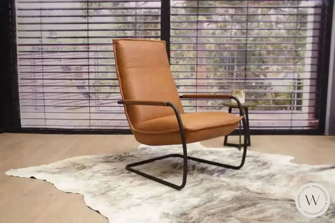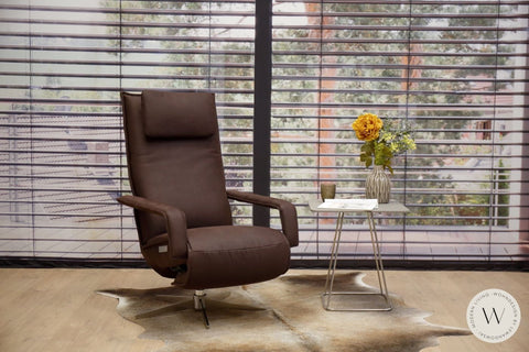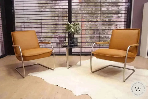 Das abgebildete Freischwinger Modell Jody V1HS von KOINOR mit einem Holzarmteil in Wildeiche ist in einem feinem Leder A India Schoko (Farbe siehe Abb. dunkelbraun) überzogen. Das Untergestell ist schwarz matt.