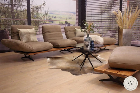Das abgebildete Sofa Modell Mooove von Koinor ist ein Liegensofa EXPL. Überzogen ist das Sofa in einer feinen Mikrofaser Bison 13-89 (Bezugsteil 1 - Sitz) und einem flauschigen Stoff Doodle 20-87 (Fabe s. Abb.), ausgestattet mit einem Holzplateau in Wildeiche furniert.