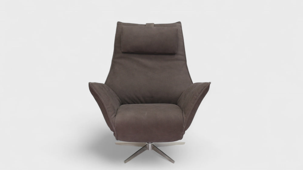 Der abgebildete Relaxsessel Modell Safira VM2 von KOINOR ist mit motorischer Relaxfunktion inkl. Akku sowie einem Nackenkissen YN2 ausgestattet und in einem feinen Leder D Denver cottage (Farbe s. Abb. braun) überzogen, der Sternfuß N°4 ist in nickel satiniert (Edelstahloptik) gehalten.