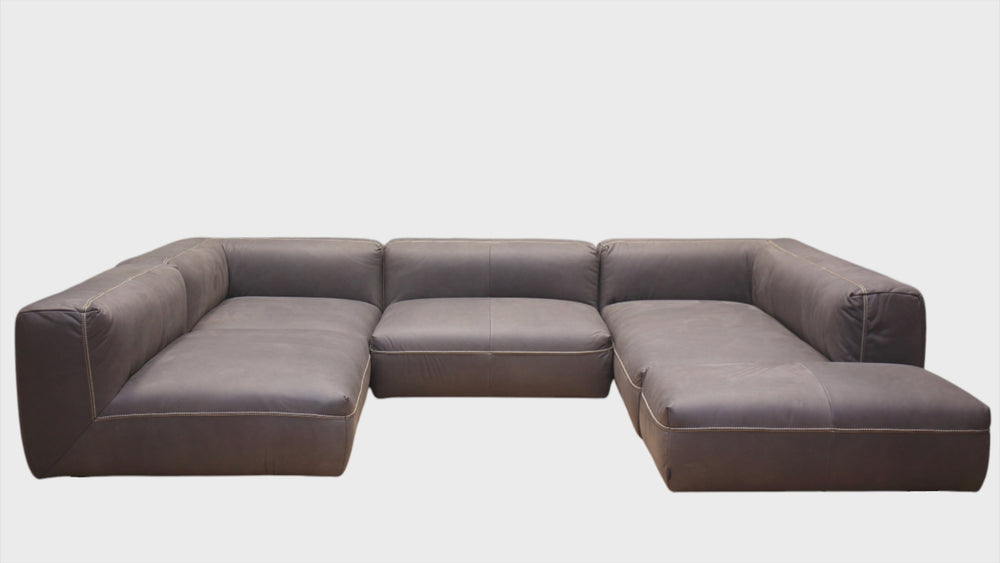 2,5-Sitz Sofa tief links handcrafted* HC58t, einem Element tief links handcrafted HC12t, einem Element tief handcrafted HC13t & einem Hocker handcrafted HC555 überzogen in einem feinen Leder Oasis Elefant 2100/63 (Farbe s. Abb. stein). Bei der Lederverarbeitung wurde eine Twinnaht gewählt.